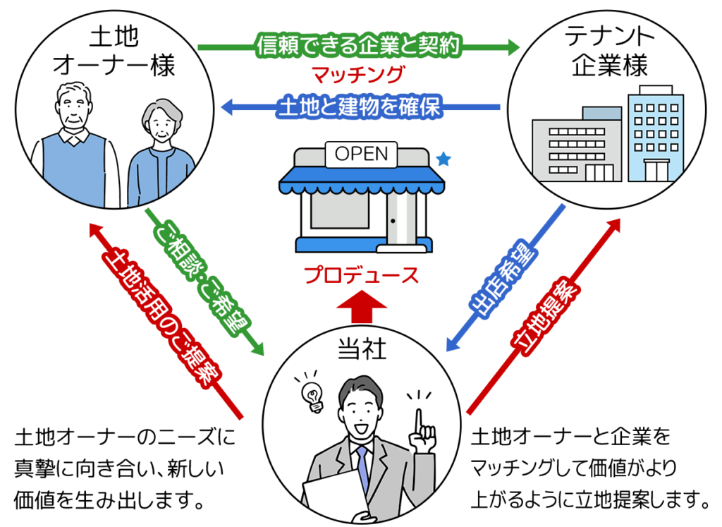 不動産の有効活用を希望する土地のオーナー様と新しい事業展開のための拠点を求める企業様のニーズを結びます。